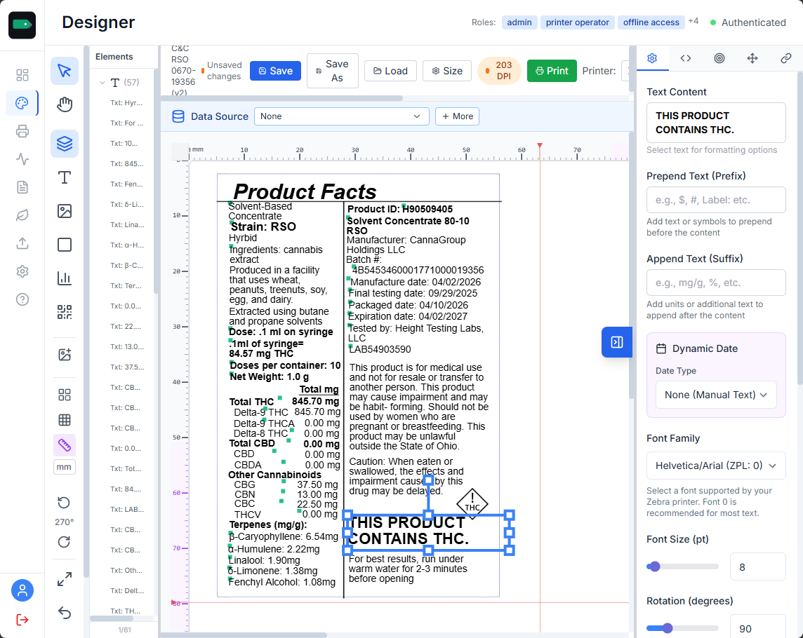 Tagestry’s designer isn’t a toy. It’s a production canvas with live METRC bindings, real-time previews, template versioning, and printer-accurate output for every job on your floor.